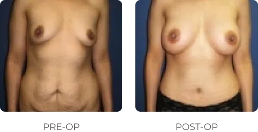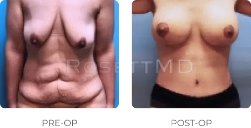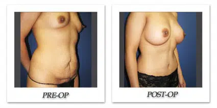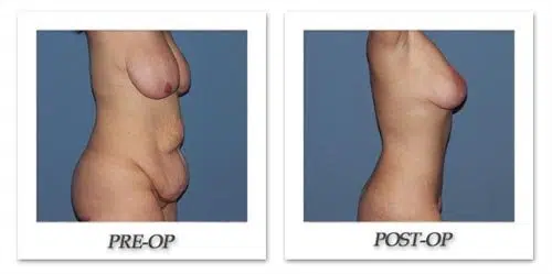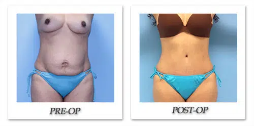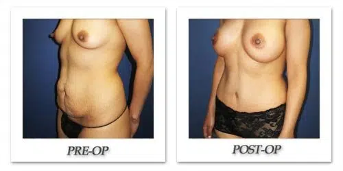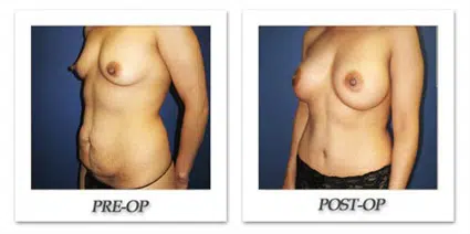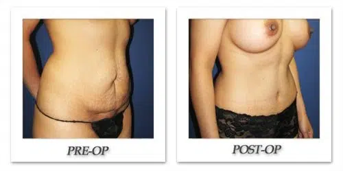 This is a 26 year old female who has two children. After her children she has the normal post operative appearance of extra skin and tissue on her abdomen. Dr. Andrew Cohen, ( the Chief of the Division of Plastic Surgery at Cedars Sinai Medical Center), performed a Mommy Makeover on her. She had a full abdominoplasty with flank liposculpture. He also performed a saline breast augmentation under the muscle with a 360cc high profile implant from Allergan. She has gone from a small A cup to a full C cup. She is 6 month post op in her post op pictures.