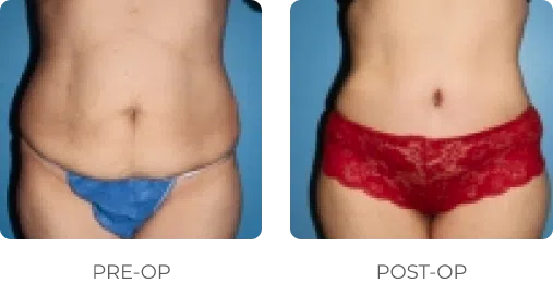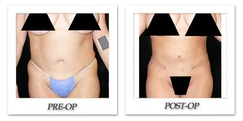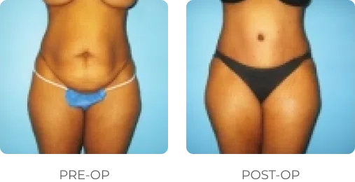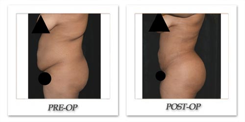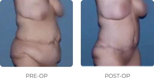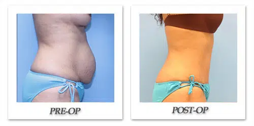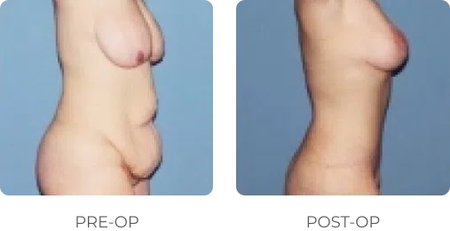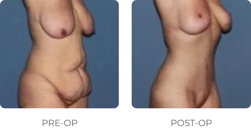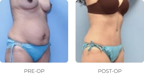 45 old female with excess fat and skin of her abdomen and waist with an overhang. History of 2 pregnancies and recent weight loss, desiring improved contour. Tummy tuck was performed along with strengthening and tightening of the muscular abdominal wall (rectus diastasis) plus liposuction of the waist and flanks. Results show a much improved contour and appearance. Also to be noted are the hidden, invisible abdominoplasty scars, the elimination of stretch marks below the belly button, and the excessive skin fold below rib cage is gone.