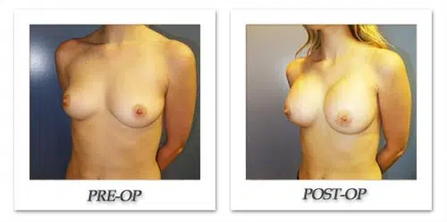 The patient is a 5ft 9, 140 lb female who presented with slightly uneven breasts and uneven inframammary folds. The patient’s chest and hips are uneven due to scoliosis (mild), and she had fat in the pectoral folds (normally referred to as tail of the breast). She chose a 430 cc cohesive gel implant often referred to as gummy bear implants.