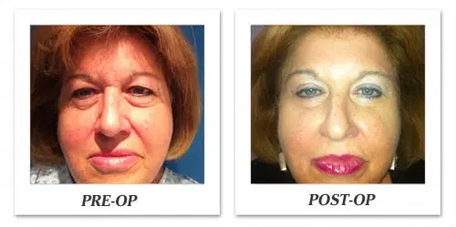 62 year old female, complaining of looking tired, puffy dark circles under the eyes, droopy upper eyelids and heaviness of the eyelids. She was evaluated by Dr. Israel and underwent upper and lower blepharoplasty procedure (eye lid surgery)
