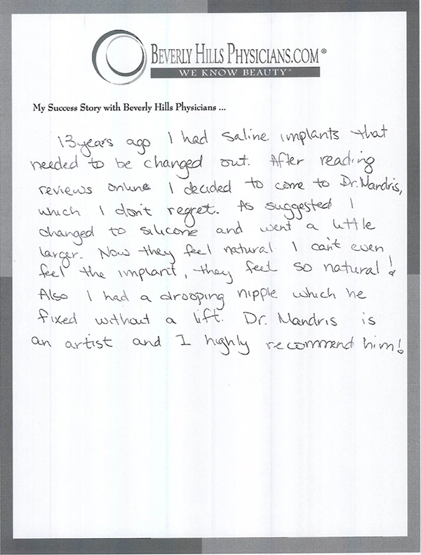 13 years ago I had Saline implants that needed to be changed out. After reading reviews online I decided to come to Dr. Mandris, which I don’t regret. As suggested I changed to silicone and went a little larger. Now they feel natural I can’t even feel the implant, they feel so natural! Also, I had a drooping nipple which he fixed without a lift. Dr. Mandris is an artist and I highly recommend him!
