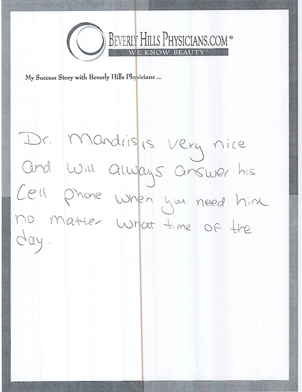 Dr. Mandris is very nice and will always answer his cell phone when you need him no matter what time of the day.